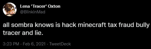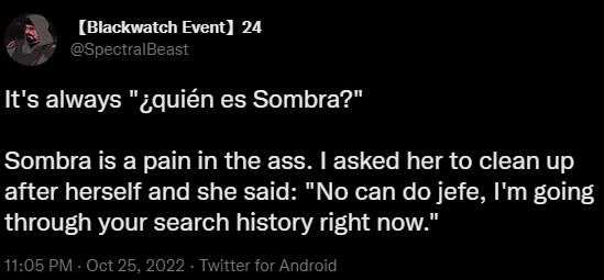 If your character doesn't have a reason to know her name, please don't refer to her with it. The only person that should know her name Is Zarya. Lynx-17 and Volskaya could also potentially know Sombra's name, but I'll leave that up to any Lynx or Volskaya writers.
