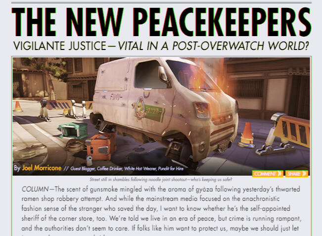 joined blackwatch, shaped up, got freaked when reyes started executing prisoners, transferred to bodyguard work on the echo project when blackwatch got burnedwhen ana amari disappeared they assigned him to track her down, figure this was probably his breaking point.went off the radar, did some vigilante justice, did enough to get a pretty decent bounty on his head, may or may not be doing some journalism under the alias "joel morricone," he's not very secretivehere's the thing. he's not as fired up as he used to be. i figure vigilante work is his last-ditch effort to be someone useful after he got burned so badly, but seems to me like he just wants to be left alone. that houston train job where he killed a dozen grunts? he punted the damn thing off the train so he could finish his ride in peace. didn't care if we got our hands on it or not.he's not going to cause problems unless we kick the hornet's nest. as long as it doesn't directly involve him, it's likely he won't intervene.