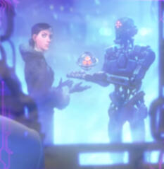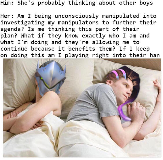 She leans on his shoulder, exhausted at the day's revelations. The conspiracy web is still projected on the wall, her deepest fears laid bare, and Genji comforts her with the tale of a child meeting a storm god."Do you still think she's a projector?""No. Alien, maybe."