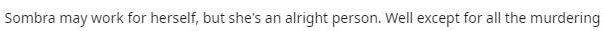 Sombra will react badly to being touched, and will not form meaningful relationships easily. She will make friends on a surface level. It took her six months to hold hands with @RYUUBUSHIN, and nearly a year for her to call him her boyfriend. (This is also a secret. Your character should only know about this if you've had a thread with us where they find out.)