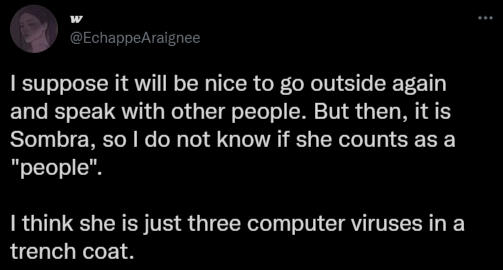 There are enough people kissing Akande’s ass. She sees the way his brow creases when they do, so she won’t outright sass him but she’s not exactly formal either.“Everyone has a signature,” she explains, a hand on her hip and the other gesturing to her work, “a personal touch, bien? It shows the community who did the work.”“And yours is the skull.”“Yes.”“And the purple.”“Sí.”“And the…”“Tron lines.”“I see.”Doomfist takes a step to look at the omnic from a new angle. She demonstrates all of the symptoms-- a skull projected in front of her faceplate, purple biolighting to match. She’s stuck in a repeating window-washing motion, arms cycling, and when Akande waves a hand in front of her face she doesn’t respond.“And this ‘signature’ is required?”“No,” she snorts, “of course not. That’s just for demonstration purposes. It’s showing you where the virus is in her systems.”His posture straightens, his nod approving. “And is she aware?”“Not at all,” Sombra shakes her head, “out like a light, won’t remember a thing.”His gaze moves to her, his gaze unreadable when he says “not unlike the crisis.”The moment feels much longer than it is.“Except I can’t make them self-sustaining,” the explanation is rough, “they aren’t thinking. They find a recent action and loop it.”His gaze doesn’t falter. He’s silent. She knows the tactic; she’s used it. People want to fill silence. She’s no exception.“The virus has three payloads. One is a constant, and that’s looking for open ports to infect. The other two are interchangeable. If there’s a high density of people it will initiate the loop. If there aren’t many people all it will do is add an optical input filter that removes humans.”The longer she speaks, the more the corner of his mouth lifts in the slightest of smiles. “I appreciate people on my team who produce results,” he finally says, and Sombra relaxes.“Please.”Both humans turn their heads to look at the omnic. Her arms are still cycling. The joints are beginning to creak. Sombra thinks that if the omnic could form an expression it might be desperate.“Please. Please. Please. Please.”“Old speech file playing,” Sombra decides, though her words are slow, “just a coincidence.”Standing at full height, arms crossed, brow furrowed at the omnic, Doomfist is the picture of intimidation. Sombra’s grateful when he asks “How quickly will it spread?”“By the time you give your speech, jefe, a third of Numbani’s omnic population will be under your control.”