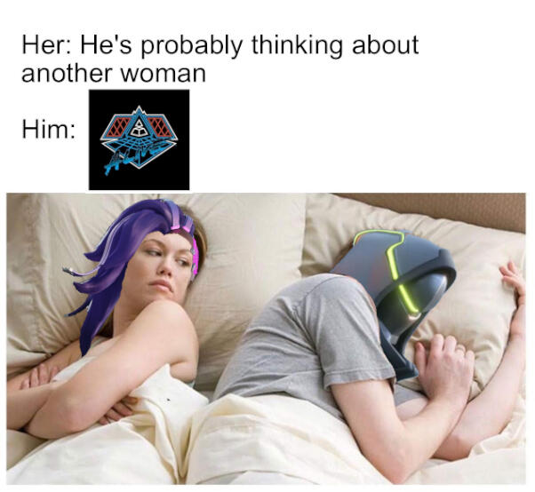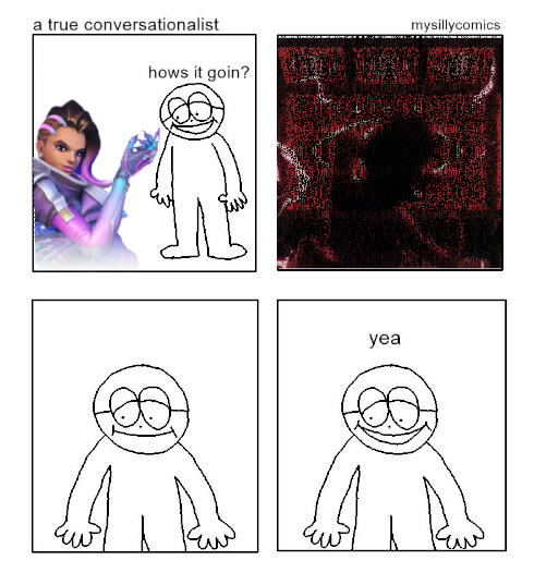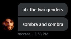 It's early in the morning. Genji's asleep. Sombra goes into the kitchen for a glass of water.There's a dragon there. They stare at each other."...Sorry I called you a projector."